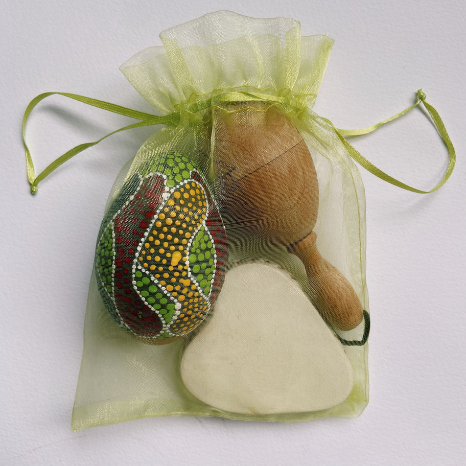 The Mixed Easter music bag contains three awesome instruments; large painted egg shaker, maraca and a heart shaker all together in a green organza bag